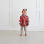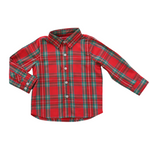 A classic look that never goes out of style! This red-and-green holiday plaid button down is perfect for dressing up little gentlemen for family photos, Christmas dinner, or Santa visits. Soft, lightweight, and timeless—it pairs perfectly with sibling styles for the sweetest matching moments.