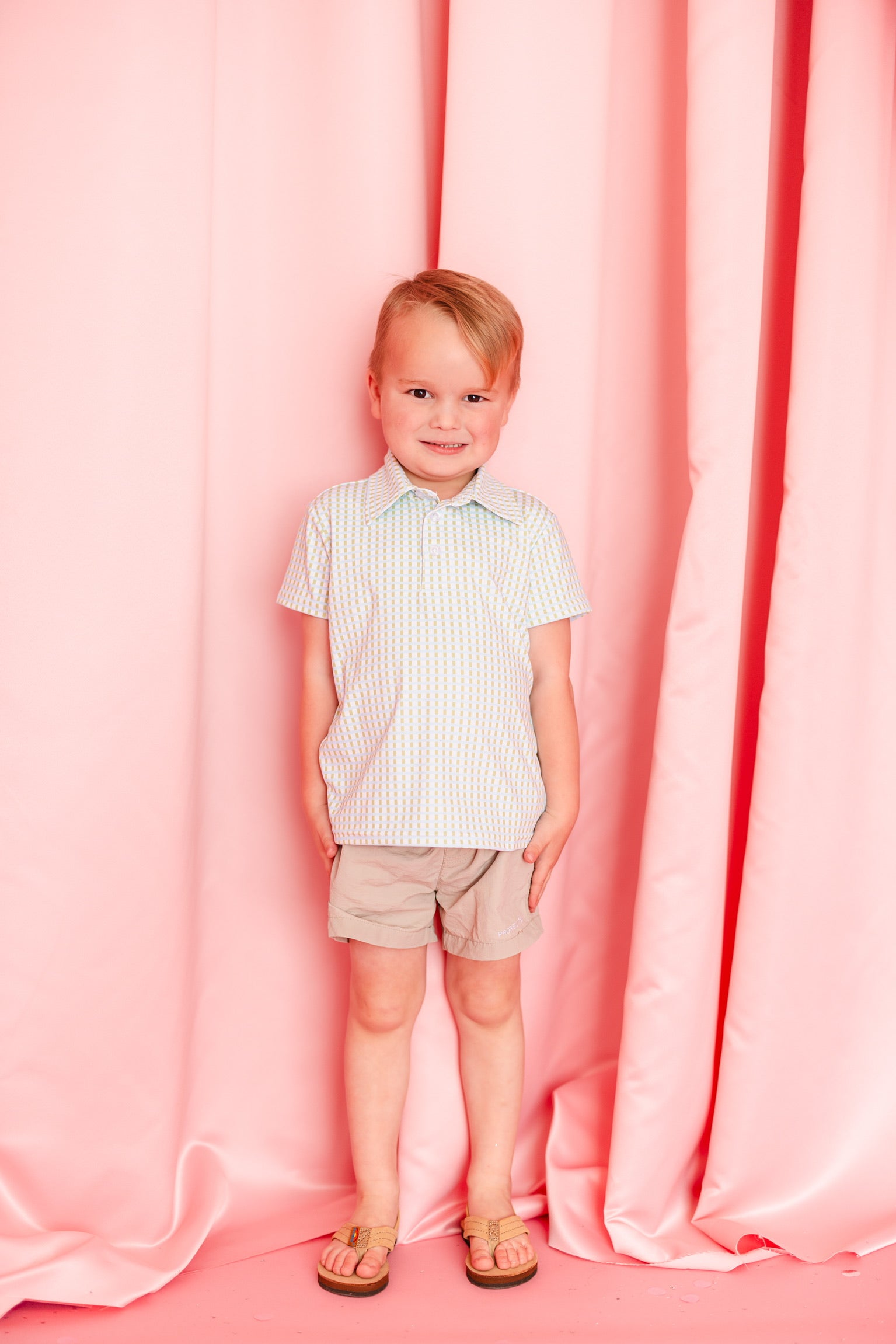 Your little guy is going to look so handsome in our Kyle Polo! Designed for spring and summer adventures, this polo features a fresh blue and green geometric print that’s as cool as he is. Whether he’s hitting the playground, the golf course, or just the snack bar, this shirt keeps him looking sharp and feeling comfortable.